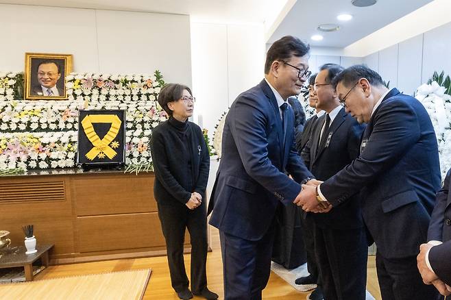 | ▲ 윤상현 국민의힘 의원이 28일 오전 서울 종로구 서울대학교병원 장례식장에 마련된 故 이해찬 전 국무총리의 빈소에서 조문후 김민석 총리와 정청래 민주당 대표와 인사하고 있다. |