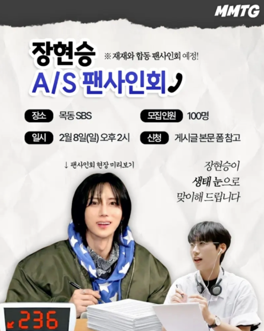 '문명특급' 측은 "생태 눈으로 돌아온 장현승의 A/S 대면 팬사인회를 진행한다"라며 "재재와의 합동 팬사인회다. 장현승이 생태눈으로 맞이해 드린다"라고 알려 눈길을 끌었다.