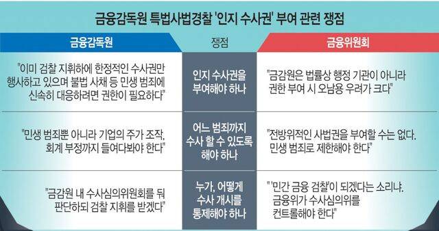 처음부터 인지수사권을 지닌 채 출범한 금융위 특사경과 대조된다. 검찰의 자본시장 범죄 수사 과정에서 전문 인력 필요성이 제기되자 금융위는 2022년 자본시장조사단 내에 자체 특사경을 신설했다. 금융위 특사경은 혐의를 인지하면 즉시 수사를 개시할 수 있다. 정반대 출발점에도 금융위는 금감원에 특사경에 대해선 인지수사권이 필요없다는 입장을 고수해 왔다.