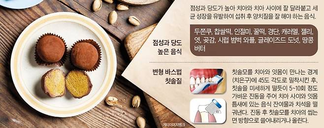 이런 음식을 섭취한 후에는 올바른 양치질로 잘 제거하는 것이 중요하다. 임현창 교수는 “음식 잔여물은 충치균에 지속적인 영양분을 공급해 치아 부식을 가속화하고 치석의 원인이 될 수 있다”며 “치아와 잇몸에 잘 끼는 음식을 먹었을 때는 칫솔을 45도 각도로 대고 진동을 주어 쓸어내는 ‘변형 바스법’으로 양치질을 하는 것을 권장한다”고 말했다. 칫솔을 기울여 양치하는 변형 바스법은 치아와 잇몸 경계 부위의 치태를 제거하는 데 도움이 된다<그래픽 참조>.
