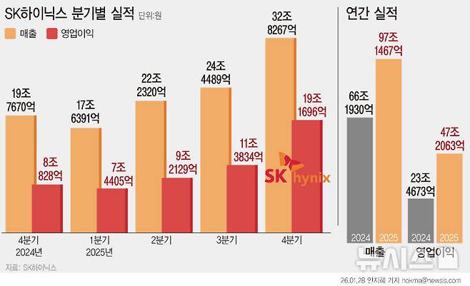 [서울=뉴시스] SK하이닉스는 지난해 매출액 97조1467억원, 영업이익 47조2063억원의 실적을 기록했다고 28일 밝혔다. 지난해 4분기 영업이익률은 58%를 기록했다. 고대역폭메모리(HBM) 뿐만 아니라 서버용 일반 메모리 수요도 크게 늘어난 것이 분기 사상 최대 실적 달성에 기여한 것으로 분석됐다.