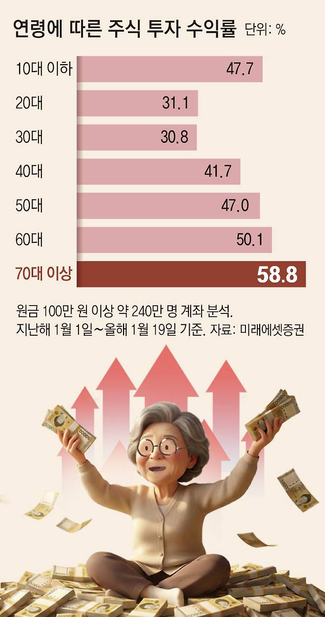 70세 이상 투자자는 한번 매입한 주식을 쉽게 팔지 않는 성향 덕에 수익률을 높였다. 지난해 연 수익률 30%를 낸 부산의 70대 남성 투자자는 “반도체 등의 분야에서 한국 1위 기업 몇 곳에 투자한 뒤 주식을 판 적이 없다”고 했다.