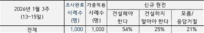 한국갤럽 자체조사(전화면접) 문항은 "작년 제11차 전력수급기본계획에는 신규 원전 2기 건설이 포함되었는데요. 현재 계획 추진 여부가 재논의되고 있습니다. 귀하는 이에 대해 어떻게 생각하십니까?"이다.