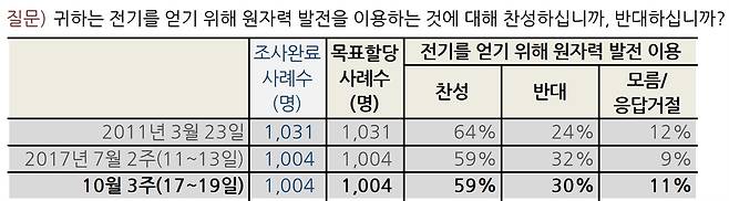 '원자력 발전 필요성'은 전화면접 89.5%, ARS 82.0%, '원자력 발전 안전성'은 전화면접 60.1%, ARS 60.5%, '신규 원전 계획 추진 동의'는 전화면접 69.6%, ARS 61.9%로 나타났다. 상당히 높은 비율이라서 언론 기사에서는 '원전 필요성이 10명 중 9명에 달한다'는 식의 제목이 달렸던 것 같다.