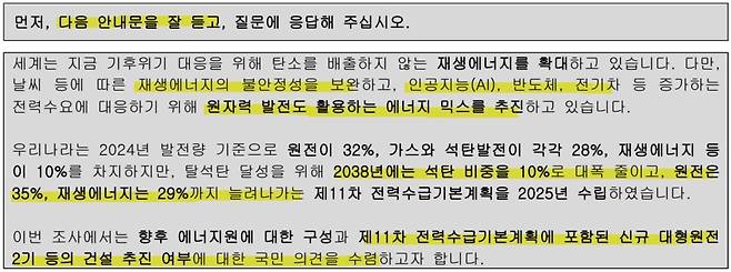 응답자에게 주는 연상 효과는 ① 조사 의뢰는 이번 정부 기후에너지 환경부, ② 전력수급기본계획 관련 의견 파악 중, ③ 재생에너지 확대 필요, ④ 그렇지만 재생에너지는 불안정, ⑤ 인공지능·반도체·전기차에 전기 필요, ⑥ 원자력 발전 활용하는 에너지 믹스 추진, ⑦ 신규 대형원전 2기 건설 추진 포함된 기본계획 관련 의견을 수렴한다는 순서다.