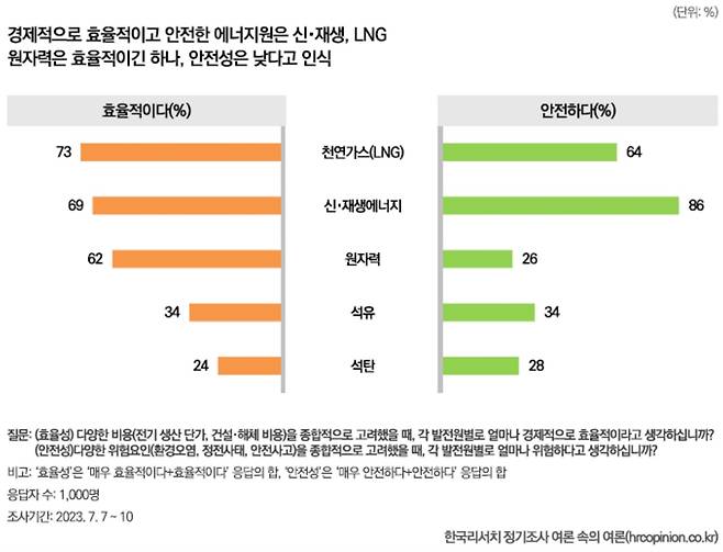 | ▲ 발전원 안전성 비교 인식(한국리서치) 2023년 10월 한국리서치의 "여론 속의 여론"에는 발전원별로 안전성과 효율성을 비교했다. 원자력에 대한 안전성 인식은 최저였다. |