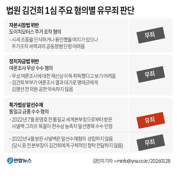 재판부가 가장 덜 해석해도 되는 사안이다. 다시 말해 "가장 명백해서"가 아니라 "가장 덜 위험해서" 유죄로 선택됐다. 세 가지 큰 혐의(주가 조작, 여론조사 수수, 통일교 금품 수수) 가운데 가장 안전하게 "유죄" 판결을 내릴 수 있어서 그렇게 판결했다.