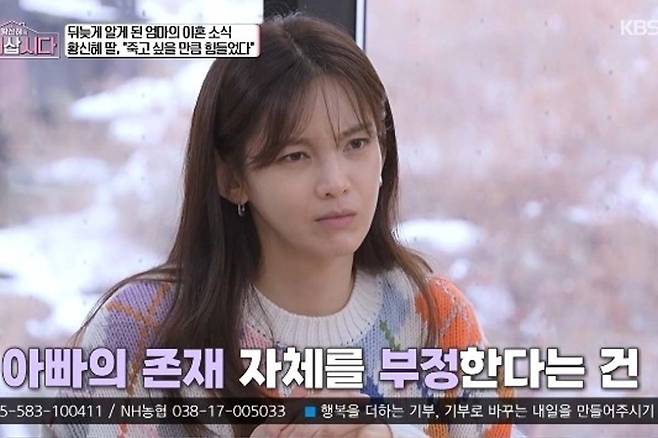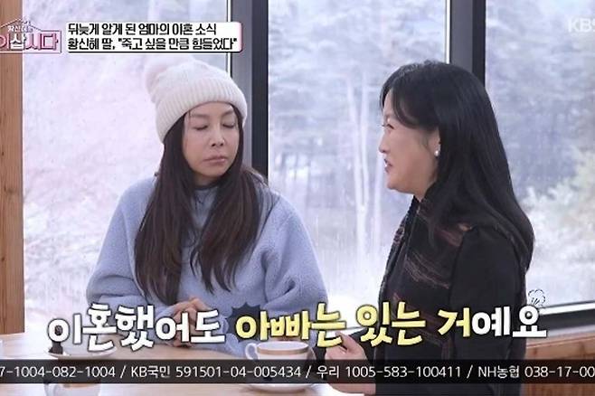 [TV리포트=강민아 기자] 방송인 정가은이 이혼 후 딸과 오랜 기간 상담을 받아온 사실을 털어놨다. 지난 28일 방송된 KBS 1TV 예능 '황신혜의 같이 삽시다'에서는 싱글맘으로 살아가는 정가은이 배우 황신혜, 장윤정과 함께 전문 심리상담가 박상미를 만나 각자의 가족 이야기를 공유하는 시간을 가졌다.