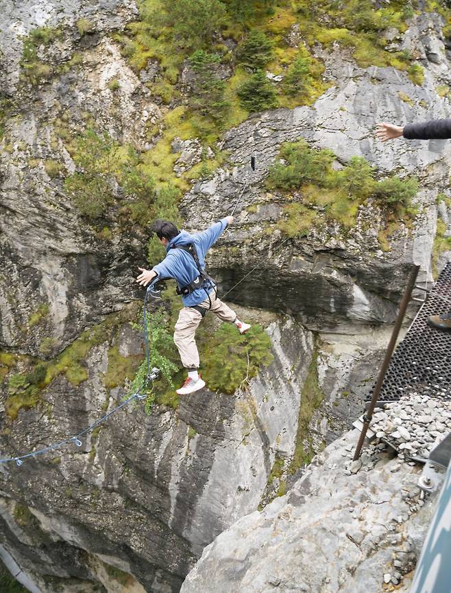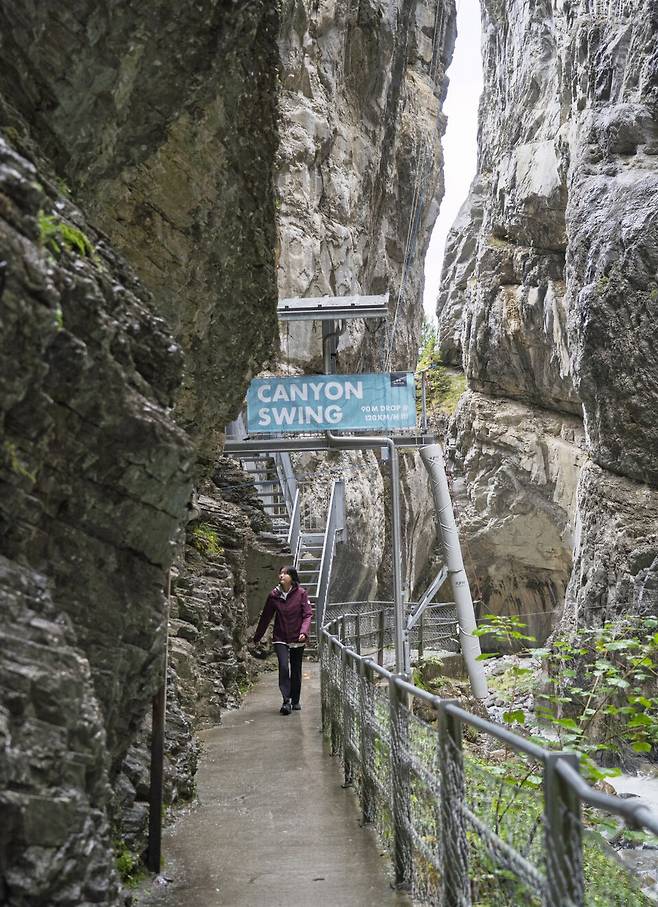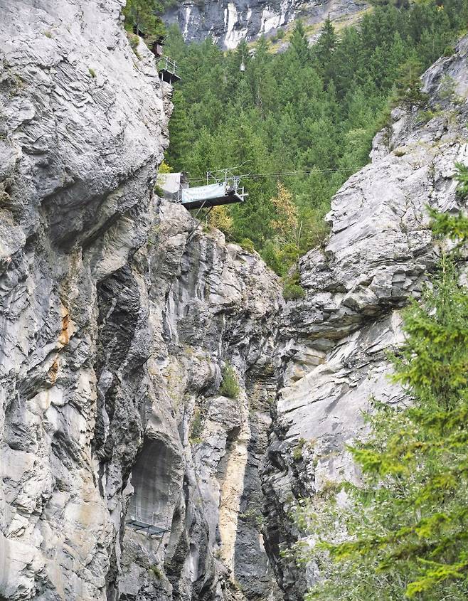 누가 그네(swing)라고 했는가. 거인이 휘두르는 골프채 헤드가 된 기분이다. 다행히 골프공과 부딪칠 일은 없다. 단지 협곡 사이를 가로질러 나는 게 전부, 펼쳐지는 풍경은 오로지 양옆의 좁은 협곡과 뤼취네 강(Lütschine)의 푸른 물살뿐이다.