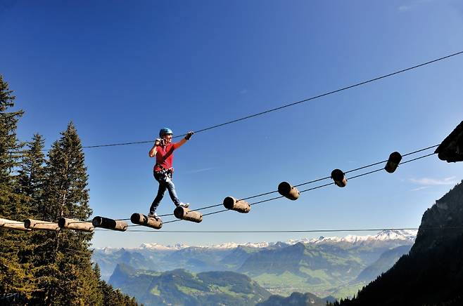 터보건을 체험할 수 있는 이곳은 '프래크뮌테크 어드벤처스(Fräkmüntegg adventures)'다. 가족 단위 여행자부터 스릴을 즐기는 모험가까지 모두 즐길 수 있는 야외 어드벤처 파크로, 10개의 액티비티를 보유하고 있다. 암벽 등반, 균형 잡기, 로프 슬라이드 등을 체험할 수 있다. 반드시 체험해야 하는 액티비티는 '드래곤 글라이더'. 500m의 길이를 용의 등에 올라탄 듯 하늘을 날며 숲속을 2분 가량 구경할 수 있다.