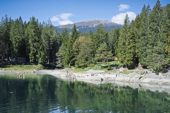 해발 1,000m 높이, 나무들이 울창하게 둘러싼 숲속에 청록색 호수 하나가 비밀스럽게 자리하고 있다. 이름은 '카우마제(Caumasee)', 길이 625m, 너비 235m의 호수다. 스위스 그라우뷘덴(Graubünden)주 플림스(Flims) 지역의 여름 대표 휴양지다.
