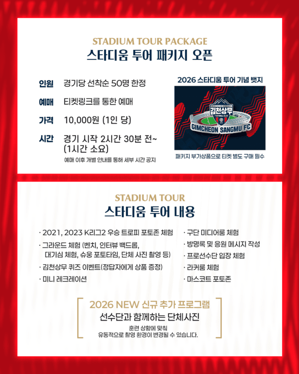 스타디움 투어 프로그램은 K리그2 우승 트로피 포토존 체험, 그라운드 및 벤치 체험, 김천상무 퀴즈 이벤트, 미니 레크리에이션, 구단 미디어룸 및 라커룸 체험, 프로선수단 입장 체험 등으로 구성됐다. 2026시즌에는 신규 프로그램으로 선수단과 함께하는 단체 사진 촬영이 추가되었다.
