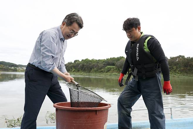 | ▲ 김동연 경기도지사가 2025년 10월 14일 달달버스를 타고 방문한 한탄강에서 청년어부와 참게를 옮기고 있다. |