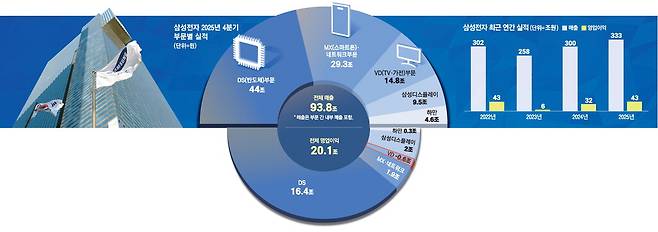 삼성전자 반도체 사업을 담당하는 디바이스솔루션(DS)부문은 지난해 4분기 HBM 판매 확대와 범용 D램 가격 상승을 비롯한 호재를 등에 업고 매출 44조원, 영업익 16조4000억원을 기록했다. 이는 전사 영업익 가운데 약 80%에 해당하는 규모다. 연간으로는 매출 130조원, 영업이익 24조9000억원에 달한다.