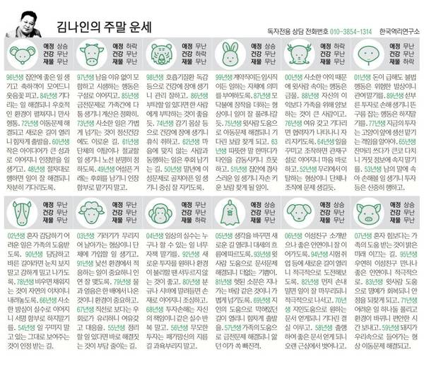申(원숭이띠)=04년생 일상의 실수는 누구나 할 수 있는 일이니 너무 자책말기를. 92년생 새로운 투자를 원하나 환경이 불리할 땐 서둘지 않는 것이 좋고. 80년생 분규나 시비에 말려들면 손재로 이어지니 조심하고. 68년생 투자손해는 자신의 책임도 있으니 같은 실수 반복하지 말고. 56년생 무모한 투자는 패가망신의 지름길이니 과욕부리지 말기를.