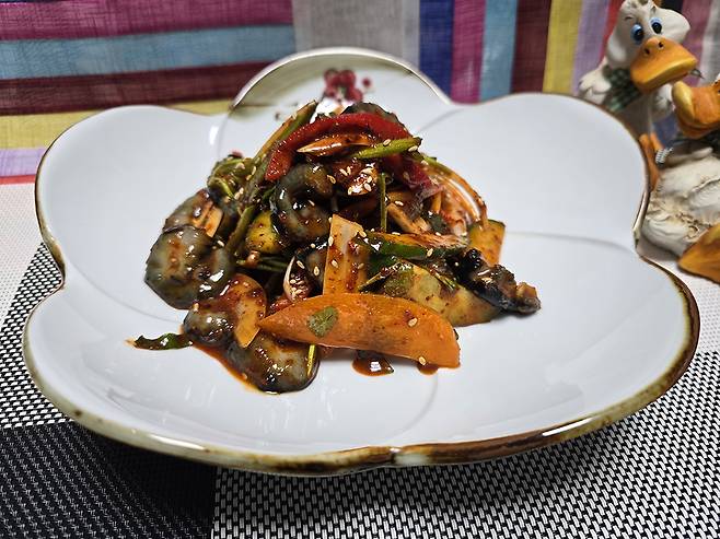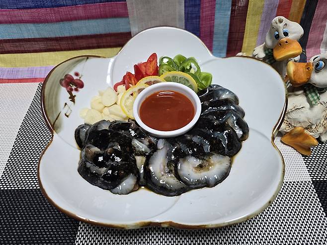 5. 접시에 ‘②’의 자른 해삼을 담고, ‘③’의 청·홍고추, 마늘 올리고, ‘④’의 초고추장을 곁들어 완성한다.