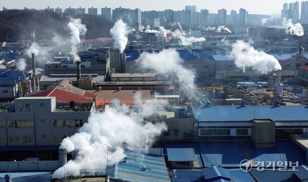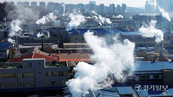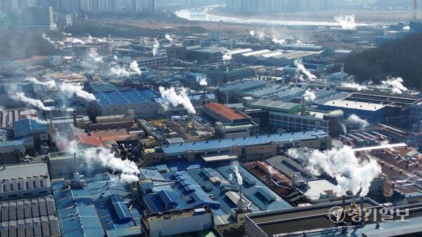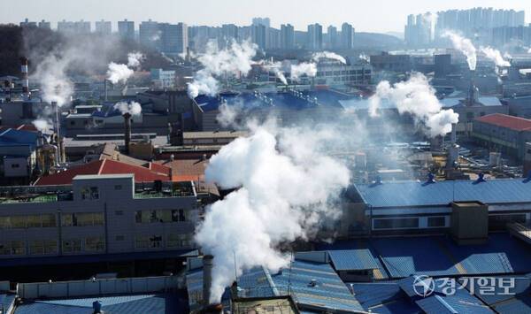 경기지역에 한파가 계속된 29일 오전 시흥시 반월·시화국가산업단지내 공장 굴뚝마다 하얀 수증기가 뿜어져 나오고 있다.