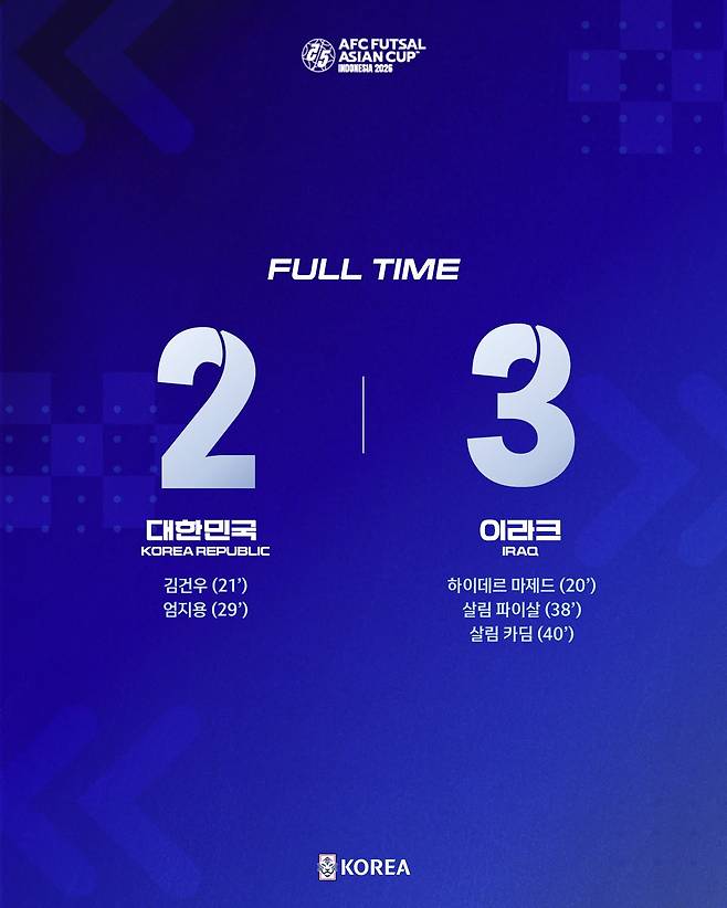 파울로 페르난데스 감독이 이끄는 한국 풋살 대표팀은 29일(한국시간) 인도네시아 자카르타에서 열린 2026 아시아축구연맹(AFC) 풋살 아시안컵 조별리그 2차전에서 이라크에 2-3으로 석패했다.