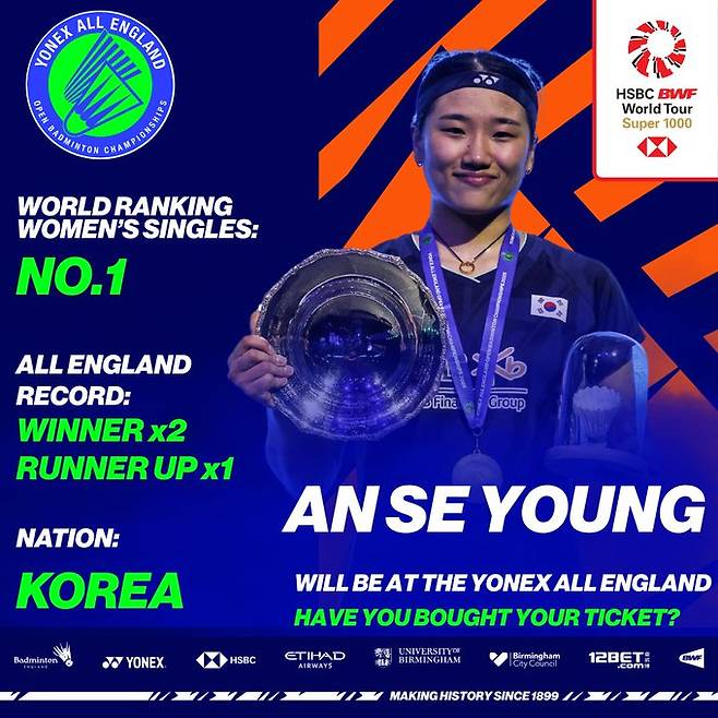 이어 "지난해 두 번째 전영 오픈 우승을 차지한 안세영이 3월 버밍엄에서 2연패, 그리고 통산 세 번째 우승을 달성할 수 있을까"라며 "지금 바로 티켓을 구매하라"고 강조했다.