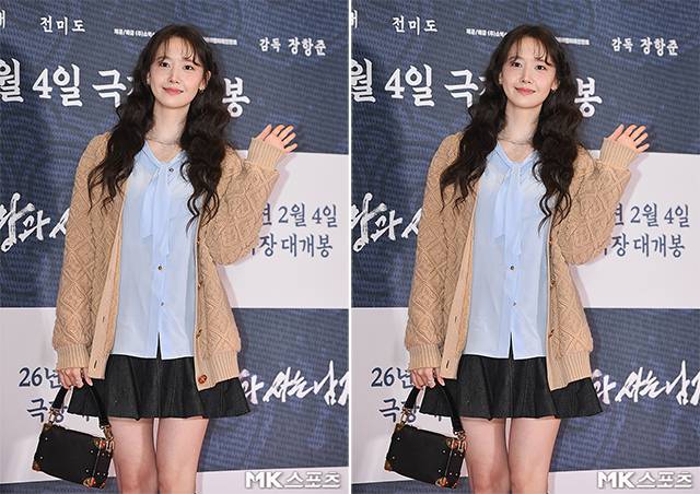 이날 시사회 포토월에 선 윤아는 하늘색 블라우스 위에 니트 카디건을 매치했고, 미니 스커트와 롱부츠로 날씬한 몸매를 강조했습니다.