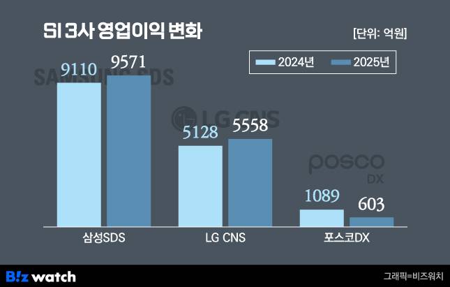 시스템통합(SI) 업계의 실적 희비가 엇갈렸다. LG CNS와 삼성SDS는 그룹사 투자 부진 속에서도 외부 수주를 확대하며 실적 방어에 성공한 반면, 포스코DX는 그룹사 투자 위축 여파를 그대로 맞아 역성장을 피하지 못했다.