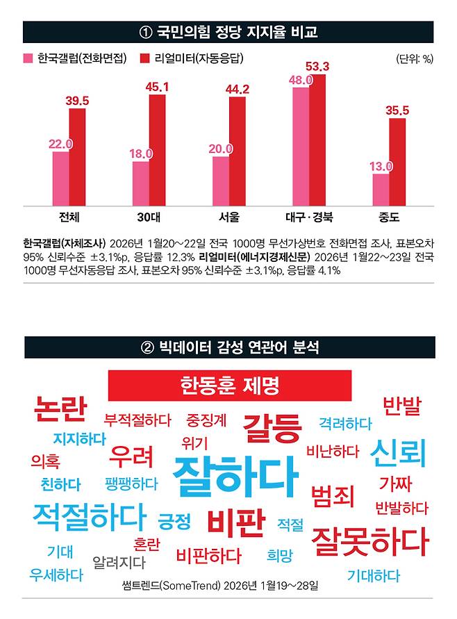 비슷한 시기에 실시된 자동응답 조사 결과를 함께 비교해 보자. 리얼미터가 에너지경제신문의 의뢰를 받아 1월22~23일 실시한 조사(전국 1000명, 무선자동응답 조사, 표본오차 95% 신뢰수준 ±3.1%p, 응답률 4.1%. 자세한 사항은 중앙선거여론조사심의위원회 홈페이지 참조)에서 '어느 당을 지지하는지' 물어본 결과 민주당 42.7%, 국민의힘 39.5%로 나왔다. 무당층은 8.9%였다(그림①).