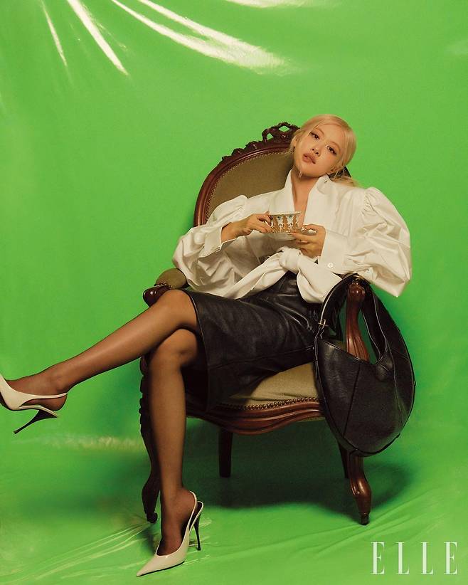 로제가 입은 포폴린 블라우스와 레더 스커트, 펌프스, 몸바사 미디엄 백은 모두 Saint Laurent by Anthony Vaccarello.