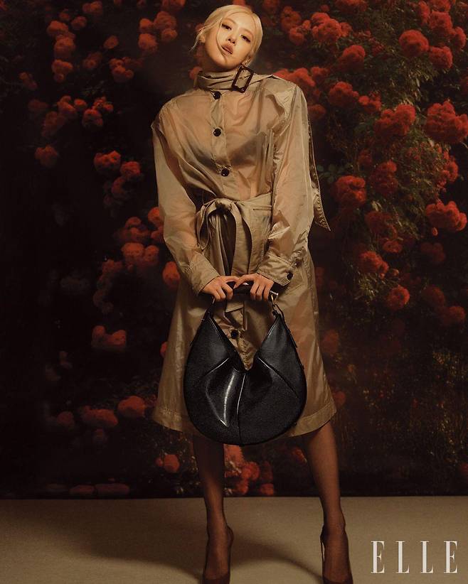 로제가 입은 패러수트 캔버스의 라발리에르 코트와 펌프스, 몸바사 미디엄 백은 모두 Saint Laurent by Anthony Vaccarello.