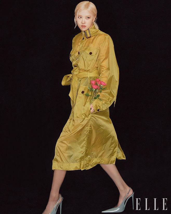 로제가 입은 패러수트 캔버스의 라발리에르 코트와 펌프스는 모두 Saint Laurent by Anthony Vaccarello.