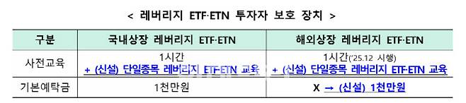 단일종목 레버리지 ETF와 ETN의 높은 리스크를 감안해 투자자 보호장치도 대폭 강화된다. 새로 도입되는 단일종목 레버리지 ETF와 ETN에 투자하려면 기존 레버리지 상품 투자를 위한 사전교육 1시간 외에 추가로 심화 사전교육 1시간을 더 받아야 한다. 이는 국내 상장과 해외 상장 단일종목 레버리지 ETF와 ETN 투자 시 모두 적용된다.