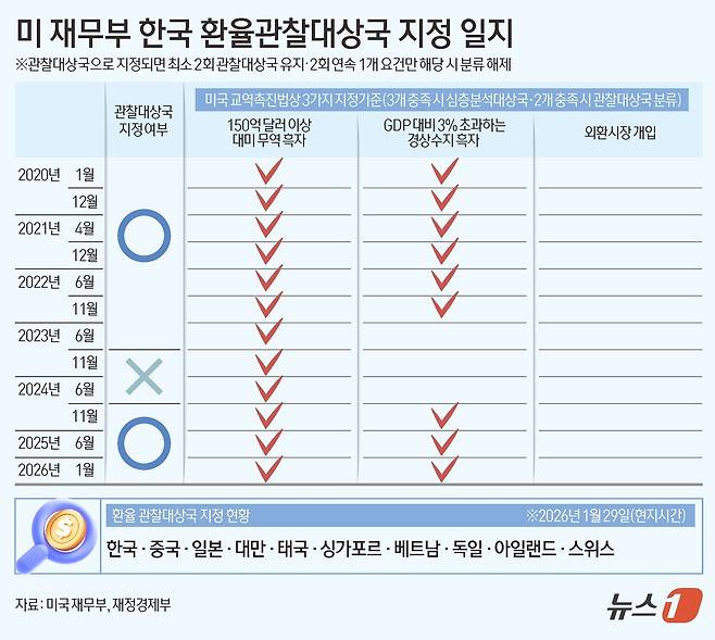 (서울=뉴스1) 김초희 디자이너 = 미국 재무부가 한국을 '환율 관찰대상국'으로 재지정했다. 대(對)미 무역흑자와 경상수지 흑자 규모가 미국 측 기준을 넘어섰다는 점이 주요 이유다. 이와 관련해 우리 정부는 미국과 긴밀히 소통하며 외환시장 안정을 위한 협력을 지속하겠다고 강조했다. 30일 재정경제부에 따르면 미 재무부는 29일(현지시간) '주요 교역국의 거시경제·환율정책' 보고서를 발표하고 한국, 중국, 일본, 독일, 스위스 등 10개국을 관찰 대상국으로 지정했다.
