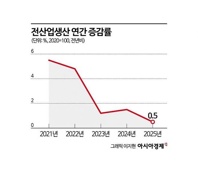 30일 국가데이터처가 발표한 '2025년 12월 및 연간 산업활동동향'에 따르면 지난해 전산업 생산은 전년 대비 0.5% 증가했다. 플러스 성장은 유지했지만 증가 폭은 코로나 회복 국면이 본격화된 2020년(-1.1%) 이후 가장 낮은 수준이다. 생산·소비·투자가 모두 플러스를 기록한 것은 2021년 이후 4년 만이다.
