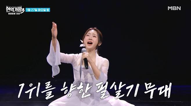 | ▲ 현역가왕3 에이스 전에서 열창하는 누룽지캬라멜팀 홍지윤 조용필의 <한오백년>을 열창하는 홍지윤의 모습은 평소 재기발랄한 분위기와는 전혀 다른 반전의 묘미를 선사했다 |