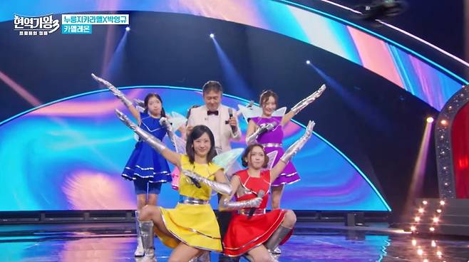| ▲ 현역가왕3 본선2차전 미니콘서트 무대를 꾸미고 있는 '누룽지 캬라멜'팀 모든 팀들의 무대가 훌륭했지만 관객과 심사위원단의 가장 큰 호응을 받은 것은 홍지윤이 꾸린 [누룽지 캬라멜]팀(홍지윤, 빈예서, 구수경, 소유미,강혜연)의 미니콘서트였다 |