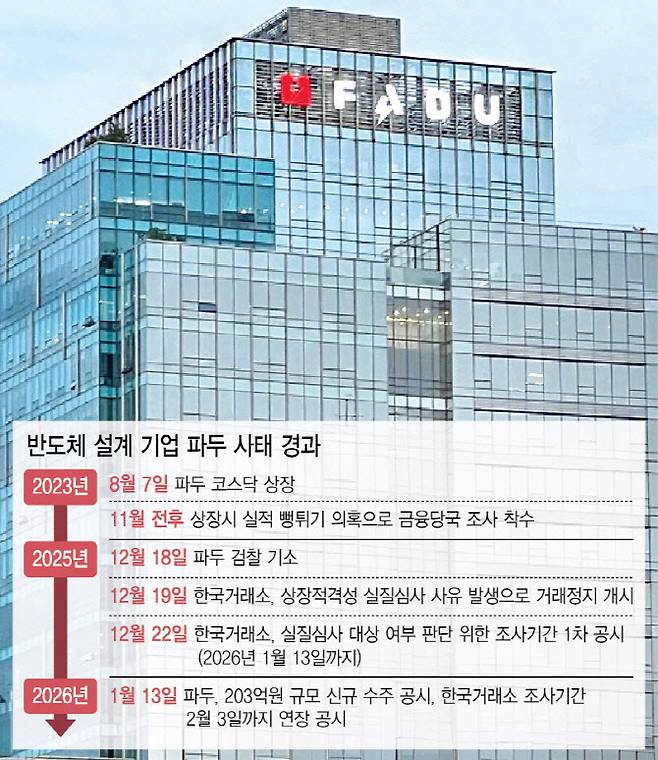 파두는 상장 과정에서의 공시 적정성 문제로 상장 적격성 실질심사 대상에 오르며 지난해 12월 19일부터 주권 매매가 정지된 상태다. 이후 거래소 기업심사위원회는 추가 조사 필요성을 이유로 심사 기간을 연장했으며, 최종 판단은 2월 초로 미뤄진 상황이다.