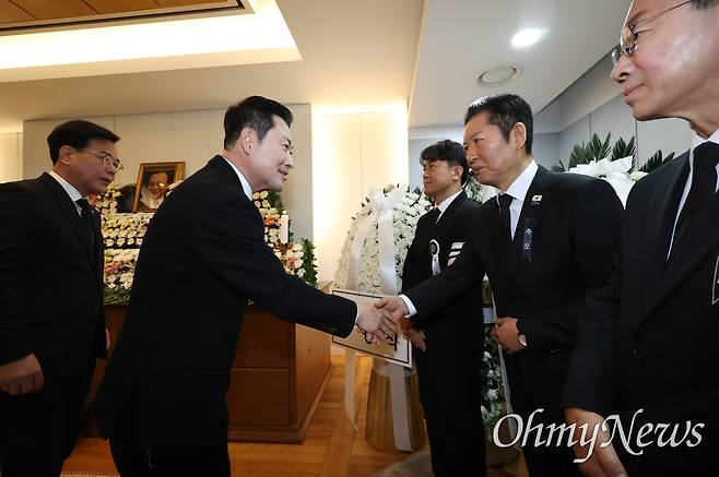 [오마이포토] 이해찬 전 총리 빈소 조문한 장동혁, 맞이한 정청래