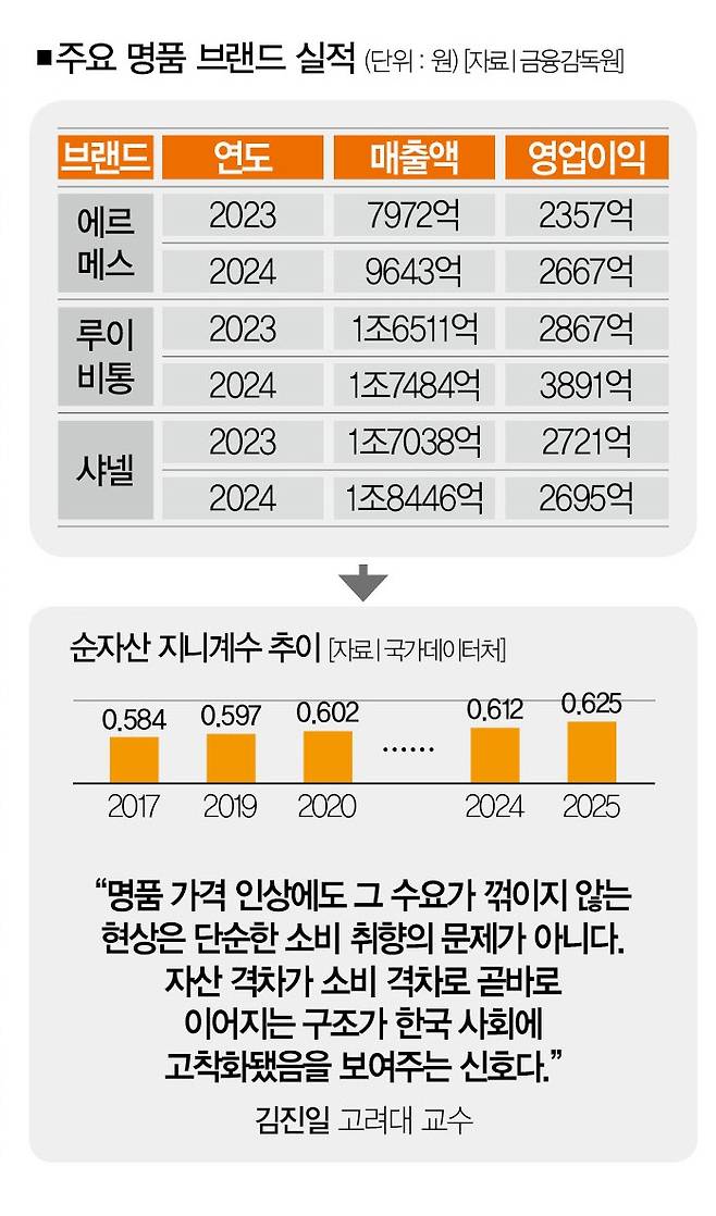이를 어떻게 해석해야 할까. 김진일 고려대(경제학) 교수의 말을 들어보자. "명품 가격 인상에도 그 수요가 꺾이지 않는 현상은 단순한 소비 취향의 문제가 아니다. 자산 격차가 소비 격차로 곧바로 이어지는 구조가 한국 사회에 고착화됐음을 보여주는 신호다. 명품 소비의 확산을 경기 회복이나 소비 심리 개선으로 해석하기보단 계층 간 생활수준과 소비 경험이 분리되고 있다는 징후로 읽어야 한다."