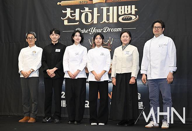 (MHN 이현지 기자) 도전자 김지호, 주영석, 김은희, 김규린, 정남미, 윤화영이 30일 오후 서울 마포구 스탠포드 호텔에서 진행된 예능 '천하제빵' 제작발표회에 참석해 포토타임을 갖고 있다.