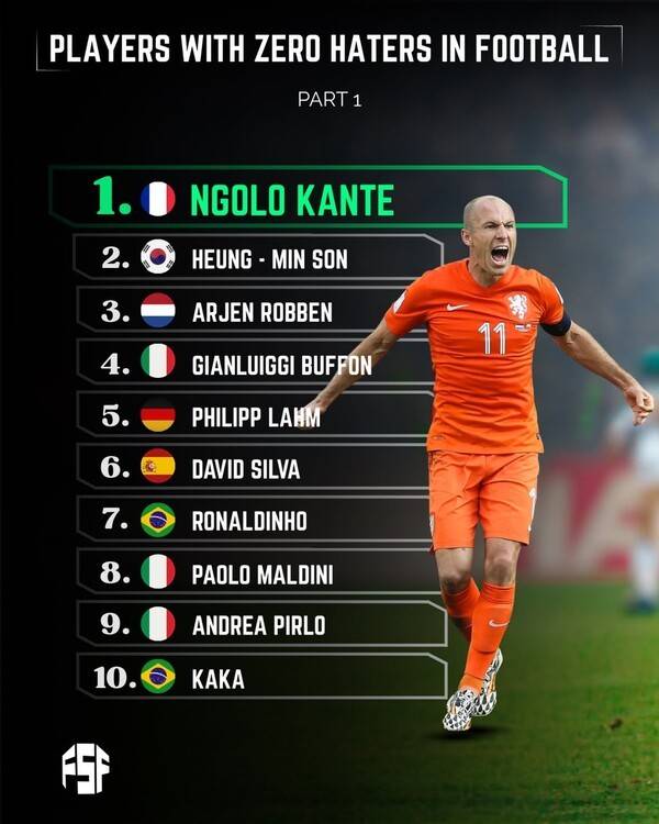글로벌 콘텐츠 전문 매체 '파이널 스코어 풋볼'은 29일(한국시간) 축구계에서 '안티가 없는 선수들' 톱 10을 선정해 공개했다.