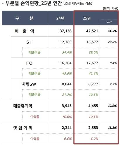 이로써 현대오토에버의 지난해 연간 매출액은 2024년보다 14.5% 확대한 4조2천521억원, 영업이익은 13.8% 증가한 2천553억원으로 집계됐다.