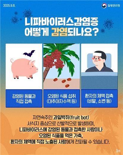 질병관리청은 ▲동물 접촉 주의 ▲생 대추야자수액 섭취 금지 ▲아픈 사람과 접촉 피하기 ▲손 씻기 ▲오염된 손으로 얼굴 만지지 않기 등을 예방 수칙으로 제시했다.