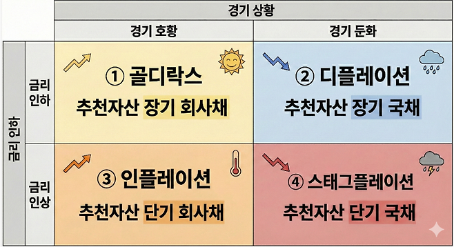 이제 금리 인상·금리 인하 × 경기 호황·경기 둔화 '4가지 경우의 수'에서 어떤 채권 상품이 유리한지 따져보자.