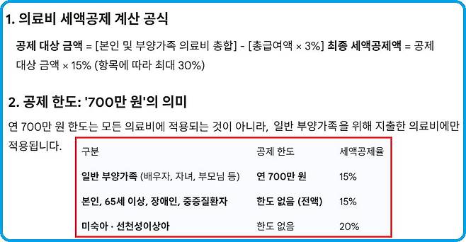 의료비의 공제율은 의료비 지출액 중 총급여액의 3%를 초과하는 금액에 대해 15% 세액공제를 한다. 일반 부양가족 의료비는 연 700만 원 한도다. 본인과 부양가족이 65세 이상인 경우와 장애인인 경우에는 공제한도가 없다. 대상항목은 진찰, 검사, 질병치료 목적의 병원비, 의약품 구입비, 안경, 콘택트렌즈 구입비(1인당 50만 원 한도), 보청기 구입비 등이다.