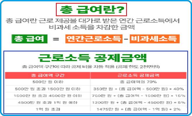 연말정산에서 말하는 총 급여 500만 원의 의미는 세전금액을 의미하지만 모든 수입을 다 합친 금액은 아니다. 총 급여란 연간소득금액 총액에서 비과세소득을 제외한 금액이다. 포함되는 소득은 기본급, 수당, 상여금(보너스), 식대(월 20만 원 초과분) 등 세금을 매기는 모든 급여다. 여기서 제외하는 항목인 비과세소득은 월 20만 원 이하의 식대, 자녀보육수당, 실비변상적 급여 등이다. 인적공제 기준이 연간 소득금액이 100만 원인데, 근로소득만 있는 경우 500만 원이라는 의미는 총 급여가 500만이지만 국가에서 인정해 주는 근로소득공제가 400만 원이기 때문이다.