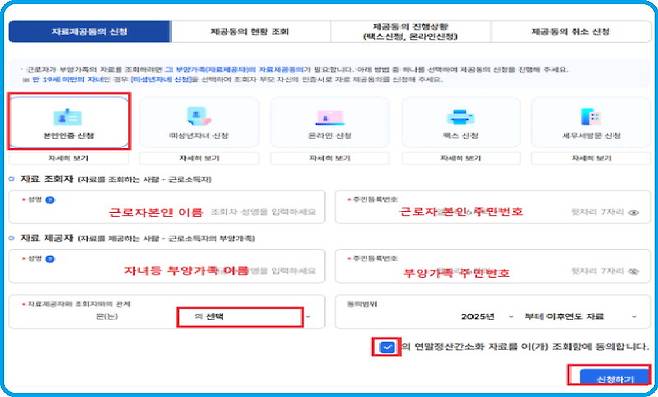 연말정산에서 신용카드 소득공제는 기본공제(인적공제)와는 달리 나이제한이 없기 때문에 소득요건만 충족한다면 공제가 가능하다. 자녀의 경우 대학생이거나 군 복무 중인 아들이고, 만 20세를 초과하더라도 공제를 받을 수 있다. 다만 근로자 본인이 실제로 자녀를 부양하고 있어야 하고, 배우자가 해당 자녀를 부양가족으로 올렸을 때는 공제를 받을 수 없다. 여기서도 기억할 것은 만 19세 이상 성인자녀의 경우 자녀가 직접 홈택스(Home Tax)에서 정보제공 동의를 해야만 부모의 연말정산 간소화 서비스에 카드사용 내역이 나타나게 된다는 것이다.