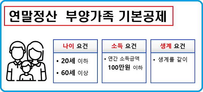 15일부터 연말정산 간소화 서비스가 제공되었다. 요즈음은 국세청이 원천징수 의무자인 회사에 연말정산 간소화 서비스를 통해 연말정산서류를 자동으로 통보해 준다. 따라서 근로자들은 자료제출 없이 관련된 내용만 점검하면 된다. 연말정산에서 부양가족 공제(인적공제)를 받기 위해서는 소득, 나이, 생계라는 세 가지 요건을 모두 충족해야 한다. 부양가족 기본공제 요건에 해당되면 1인당 150만 원의 인적공제를 받을 수 있다. 배우자는 나이조건은 없으나 소득요건은 연 소득 100만 원 이하의 요건을 만족해야 한다.