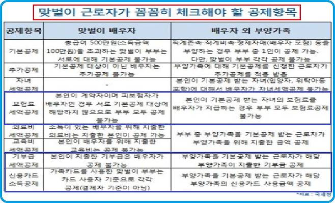 배우자의 연봉이 500만 원을 초과(근로소득만 있는 경우)하는 맞벌이라면 기본공제 대상자가 아니기 때문에 서로의 보험료를 대신 공제받을 수 없다. 특히 계약자가 본인이고, 피보험자가 배우자인 경우나 계약자가 배우자이고 피보험자가 본인인 경우 기본공제 대상자가 아니기에 상대방이 보험료 공제를 받을 수 없는 것은 물론 자신의 보험료를 지출(계약)하지 않았기에 양쪽 모두 공제가 불가하게 된다. 따라서 보험료 공제에 있어서는 계약자와 피보험자에 따라 다양한 변수가 발생하기에 유의할 필요가 있다.