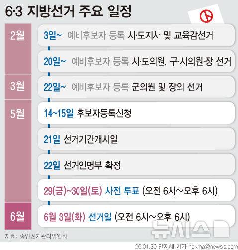 [서울=뉴시스] 30일 중앙선거관리위원회에 따르면 다음 달 3일부터 제9회 전국동시지방선거의 시·도지사 및 교육감 선거 예비 후보자 등록을 시작한다. (그래픽=안지혜 기자)