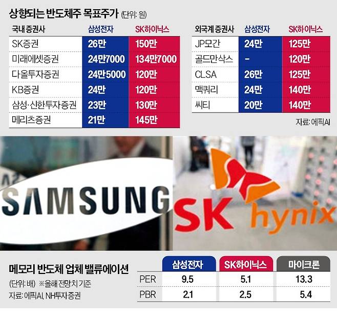 증권가에서 반도체주 목표주가 상향이 잇따르는 건 메모리 반도체 산업이 전례 없는 호황을 이어가는 가운데 주가가 경쟁사와 비교해 여전히 낮은 수준이라는 분석이 많아서다.