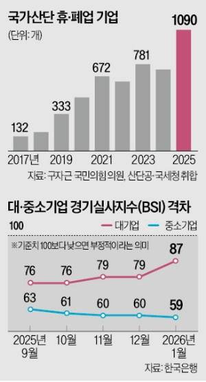 보통 국가산단엔 상대적으로 우량 중소 제조업체가 입주해 있다. 이런 국가산단 입주 기업들의 휴·폐업이 급증하는 것은 그만큼 한국 제조업 하부구조의 경쟁력이 빠르게 약화하고 있다는 방증이라고 전문가들은 설명한다. 한국은행에 따르면 기업의 경기 평가를 집계한 기업경기실사지수(BSI)는 올해 1월 중소기업의 경우 59를 기록했다. 대기업(87)과의 격차가 2021년 5월(대기업 110, 중소기업 80) 후 약 4년8개월 만에 최대치를 기록했다.